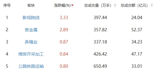 板块方面,影视院线、贵金属等涨幅靠前,医疗服务、其他电源设备等跌幅靠前。