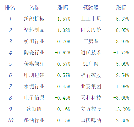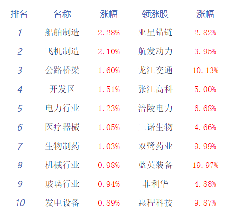 板块方面,船舶制造、飞机制造、公路桥梁涨幅居前,纺织机械、塑料制品、陶瓷行业跌幅居前。