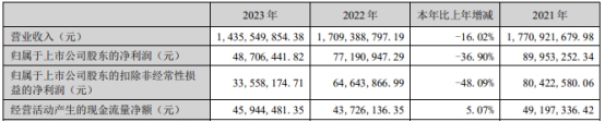 2023年,公司营业收入14.36亿元,同比减少16.02%;归属于上市公司股东的净利润4870.64万元,同比减少36.90%;归属于上市公司股东的扣除非经常性损益的净利润3355.82万元,同比减少48.09%;经营活动产生的现金流量净额4594.45万元,同比增长5.07%。