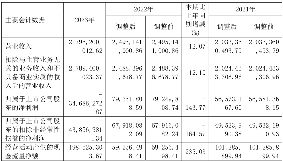 2023年,春雪食品实现营业收入27.96亿元,同比增长12.07%;归属于上市公司股东的净利润-3468.63万元,上年同期为7925.18万元;归属于上市公司股东的扣非净利润-4385.64万元,上年同期为6791.81万元;经营活动产生的现金流量净额为1.99亿元,同比增长235.03%。