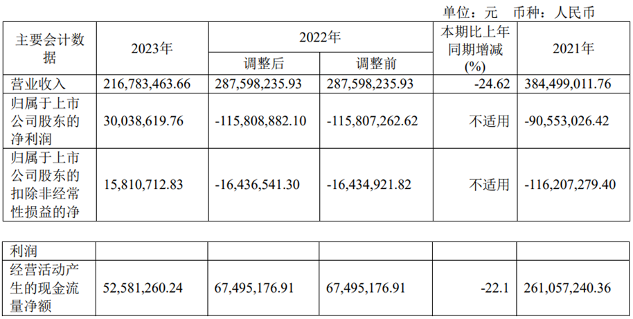 据国中水务2023年年报披露,2023年公司实现营业收入2.17亿元,同比下降24.62%;实现归属于上市公司股东的净利润3003.86万元,扭亏为盈,上年同期为-1.16亿元;实现归属于上市公司股东的扣非净利润1581.07万元,上年同期为-1643.65万元;经营活动产生的现金流量净额为5258.13万元,上年同期为6749.52万元。