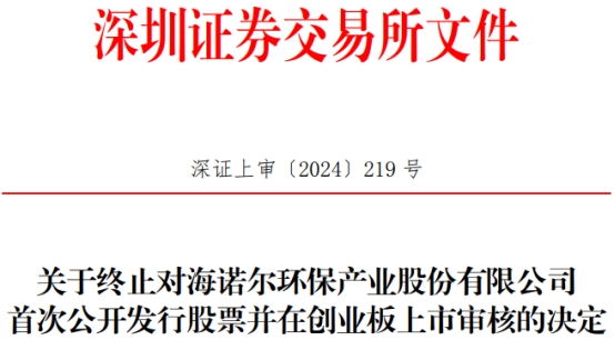 中国经济网北京7月24日讯 深交所网站昨日公布了关于终止对海诺尔环保产业股份有限公司(以下简称“海诺尔”)首次公开发行股票并在创业板上市审核的决定。