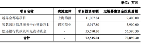 锦和商管发行募集资金总额为74,749.50万元,扣除发行费用后,募集资金净额为68,527.80万元。锦和商管最终募集资金净额比原计划少2362.5万元。锦和商管于2020年4月8日披露的招股书显示,公司拟募集资金70,890.30万元,计划用于越界金都路项目、智慧园区信息服务平台建设项目、偿还银行贷款及补充流动资金。