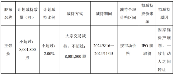 王强众计划于公告披露日起15个交易日后的3个月内(即2024年8月16日至2024年11月15日),以大宗交易的方式向上述财产信托(本次转让前未持有公司股份)转让其持有的公司无限售流通股合计不超过公司总股本的2.00%,即不超过8,001,800股。本次减持计划自公告披露之日起15个交易日后的3个月内实施。