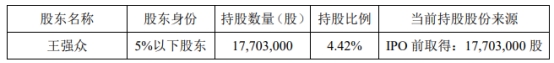 截至公告披露日,王强众持有公司17,703,000股股份,占公司总股本的4.42%。