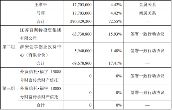 公告显示,王强众存在三组一致行动人,与王强翔、葛兰英、王淮平、马莉的一致行动关系形成原因为亲属关系;与江苏百斯特投资集团有限公司、淮安创享创业投资中心(有限合伙)的一致行动关系形成原因为签署一致行动协议;与外贸信托•福字15888号财富传承财产信托、外贸信托•福字18888号财富传承财产信托的一致行动关系形成原因为签署一致行动协议。