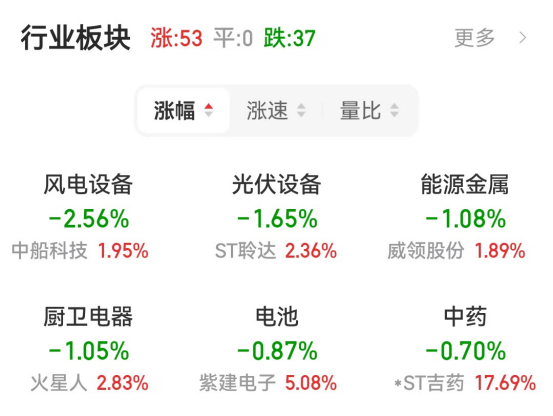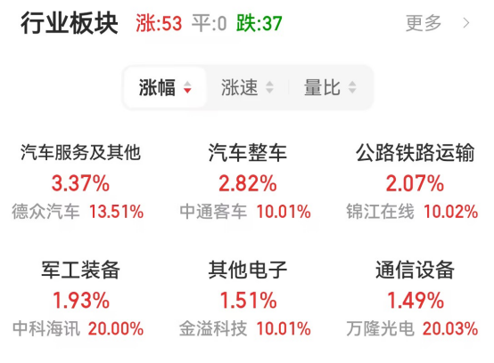 板块方面,汽车服务及其他、汽车整车、公路铁路运输等涨幅靠前,风电设备、光伏设备、能源金属等跌幅靠前。