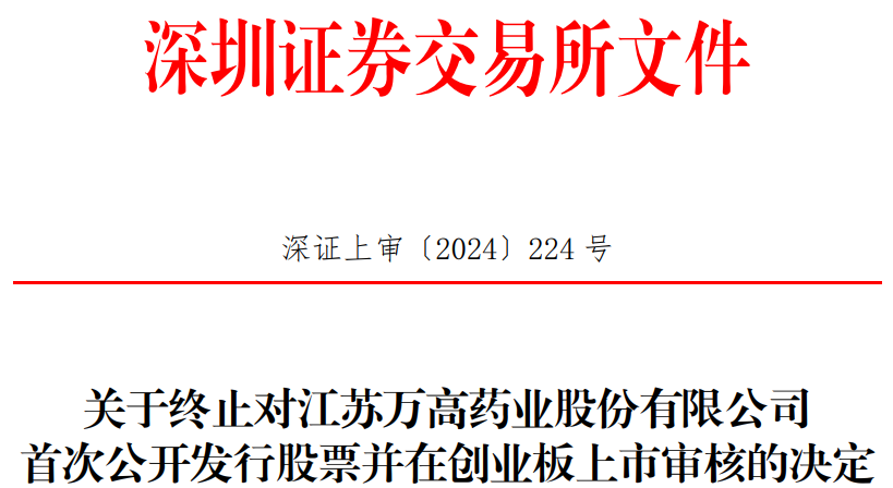 深交所于2022年6月21日依法受理了万高药业首次公开发行股票并在创业板上市的申请文件,并依法依规进行了审核。日前,万高药业向深交所提交了《江苏万高药业股份有限公司关于撤回江苏万高药业股份有限公司首次公开发行股票并在创业板上市审核申请文件的申请》,保荐人向深交所提交了《民生证券股份有限公司关于撤回江苏万高药业股份有限公司首次公开发行股票并在创业板上市审核申请文件的申请》。根据《深圳证券交易所股票发行上市审核规则(2024年修订)》第六十二条的有关规定,深交所决定终止对万高药业首次公开发行股票并在创业板上市的审核。