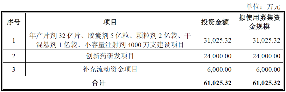 万高药业原拟在深交所创业板发行股票数量不超过2,086.67万股,且不低于本次发行后股份总数的25.00%,全部为公开发行新股,不涉及老股转让。公司原拟募集资金61,025.32万元,用于“年产片剂32亿片、胶囊剂5亿粒、颗粒剂2亿袋、干混悬剂1亿袋、小容量注射剂4000万支建设项目”、“创新药研发项目”、“补充流动资金项目”。