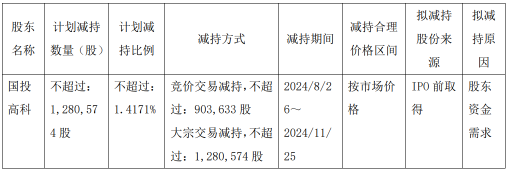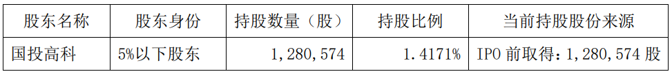 国投高科持有公司1,280,574股,占公司总股本的1.4171%。上述股份均为在公司首次公开发行前取得的股份,已于2022年12月26日解除限售并上市流通。