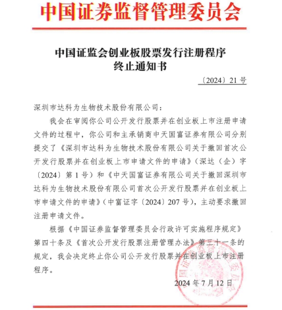 证监会在审阅深圳市达科为生物技术股份有限公司(以下简称“达科为”)公开发行股票并在创业板上市注册申请文件的过程中,达科为和主承销商中天国富证券有限公司分别提交了《深圳市达科为生物技术股份有限公司关于撤回首次公开发行股票并在创业板上市申请文件的申请》(深达(企)字(2024)第1号)和《中天国富证券有限公司关于撤回深圳市达科为生物技术股份有限公司首次公开发行股票并在创业板上市申请文件的申请》(中富证字(2024)207号),主动要求撤回注册申请文件。