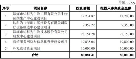 达科为原拟在深交所创业板发行股票数量不超过不超过1,998.90万股,占发行后总股本的比例不低于25%;本次发行全部为新股发行,不涉及公司股东公开发售股份。公司原拟募集资金80,000.00万元,分别用于深圳市达科为生物工程有限公司生物试剂生产中心建设项目、达科为(深圳)医疗设备有限公司医疗设备制造中心建设项目、深圳市达科为生物技术股份有限公司研发中心建设项目、营销服务网络与信息化升级建设项目、补充流动资金项目。