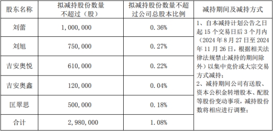 公司股东吉安奥悦持有公司股份13,000,000股,占公司总股本的4.71%,计划在公告披露之日起15个交易日后的3个月内(即2024年8月27日至2024年11月26日),以大宗交易/集中竞价交易方式合计减持股份累计不超过610,000股,即不超过公司总股本比例0.22%。