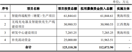 奥海科技公开发行股票募集资金总额为121,497.60万元,扣除发行费用后,募集资金净额为112,073.90万元,分别用于智能终端配件(塘厦)生产项目、无线充电器及智能快充生产线建设项目、研发中心建设项目、补充流动资金。