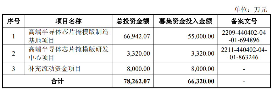 龙图光罩本次发行募集资金总额为61,743.75万元,扣除发行费用后,募集资金净额为55,346.25万元,公司最终募集资金净额比原计划少10,973.75万元。龙图光罩2024年8月1日披露的招股书显示,公司拟募集资金66,320.00万元,用于高端半导体芯片掩模版制造基地项目、高端半导体芯片掩模版研发中心项目、补充流动资金项目。