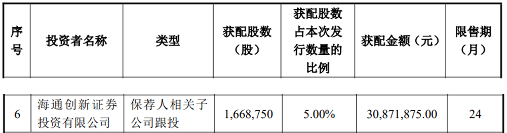 海通证券股份有限公司的全资子公司海通创新证券投资有限公司参与了龙图光罩的战略配售,获配股数1,668,750股,占本次发行数量的5.00%,获配金额30,871,875.00元,限售期为24个月。