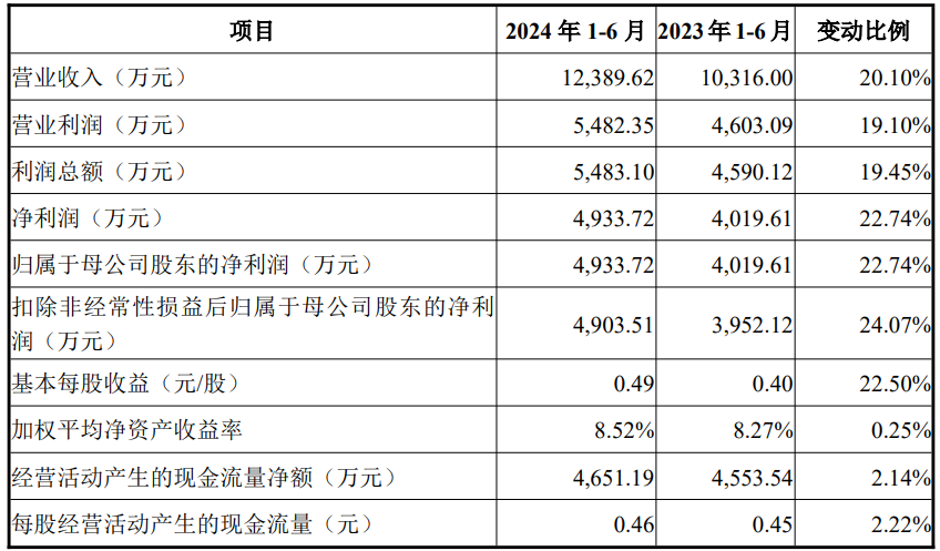 2024 年 1-6 月,龙图光罩实现营业收入 12,389.62 万元,同比增长20.10%;净利润/归属于母公司股东的净利润为 4,933.72 万元,同比增长22.74%,扣除非经常性损益后归属于母公司股东的净利润为 4,903.51 万元,同比增长24.07%;经营活动产生的现金流量净额为4,651.19 万元,同比增长2.14%。