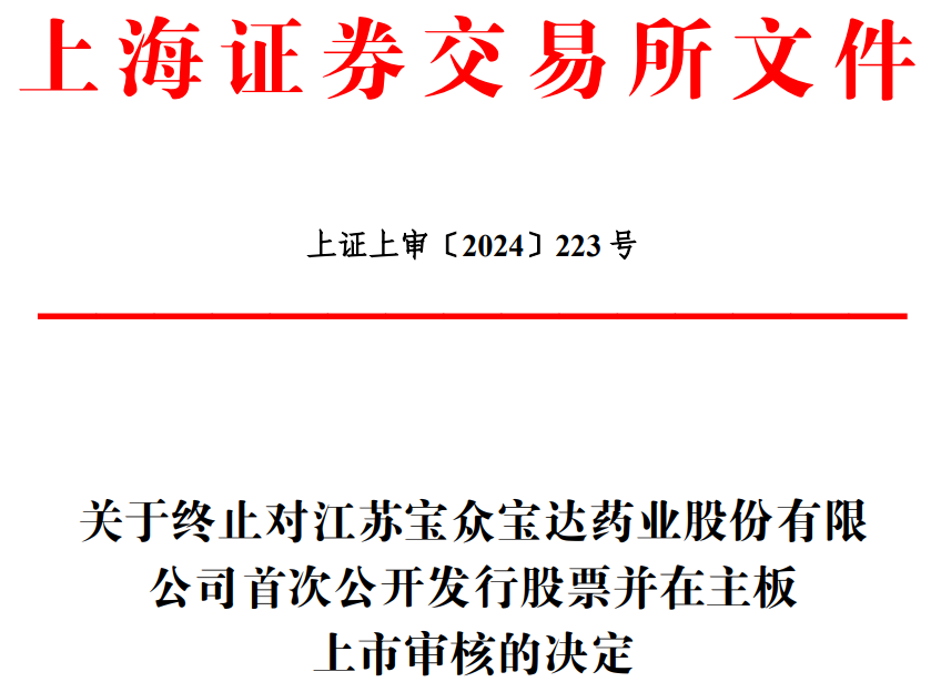 中国经济网北京8月7日讯 上交所网站昨日公布关于终止对江苏宝众宝达药业股份有限公司(简称“宝众宝达”)首次公开发行股票并在主板上市审核的决定。