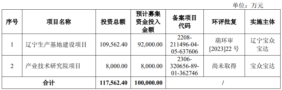 宝众宝达原拟在上交所主板公开发行股票的数量不超过4,504万股,占本次发行后公司股本总额的比例不低于10%,本次发行均为新股,不涉及公司原股东公开发售股份。公司原拟募集资金100,000.00万元,用于辽宁生产基地建设项目、产业技术研究院项目。