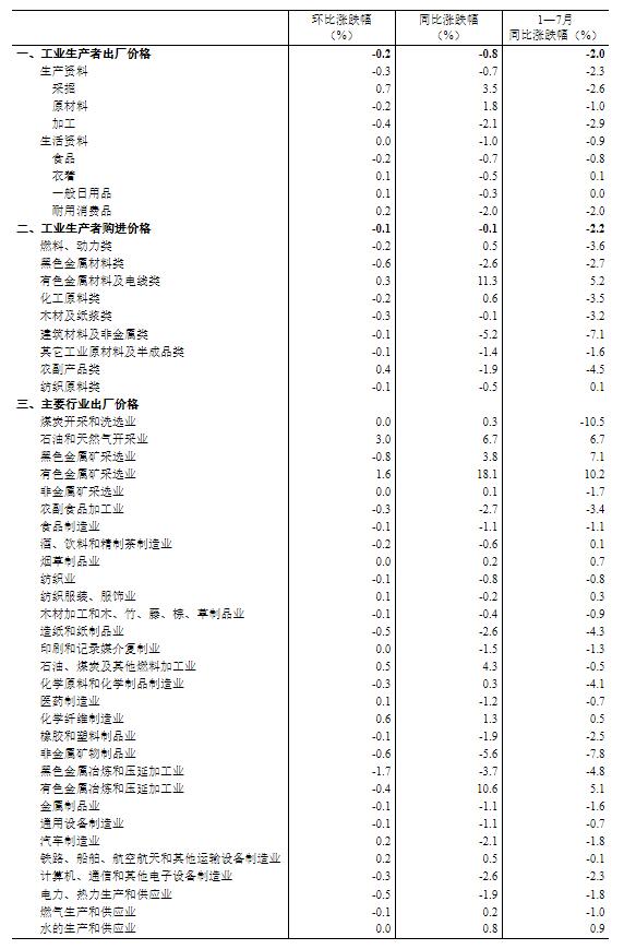 国家统计局:7月PPI同比下降0.8% 环比下降0.2%