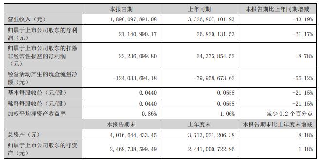 国际实业2024年半年度报告显示,2024年上半年,国际实业实现营业收入18.90亿元,同比下滑43.19%;归属于上市公司股东的净利润2114.10万元,同比下滑21.17%;归属于上市公司股东的扣除非经常性损益的净利润2223.61万元,同比下滑8.78%;经营活动产生的现金流量净额-1.24亿元,同比下滑55.12%。