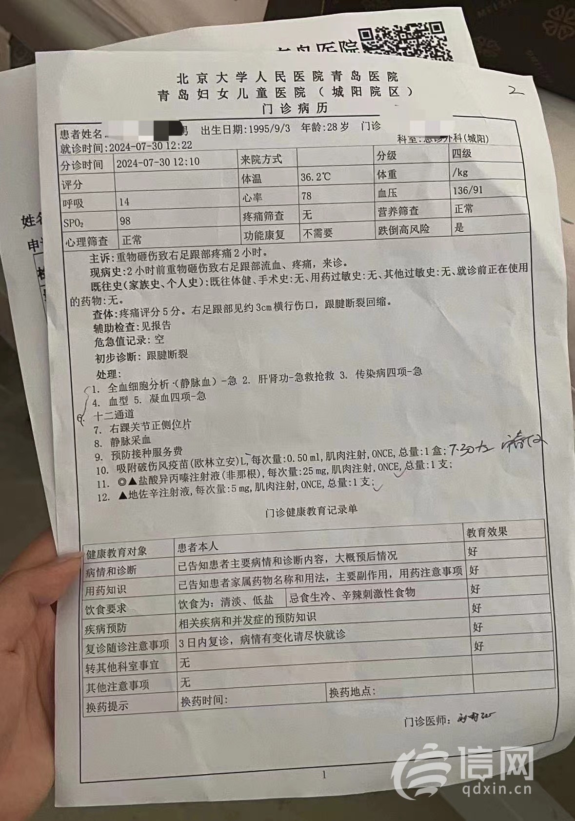 青岛妇女儿童医院(城阳院区)的门诊报告。(来源:受访者)