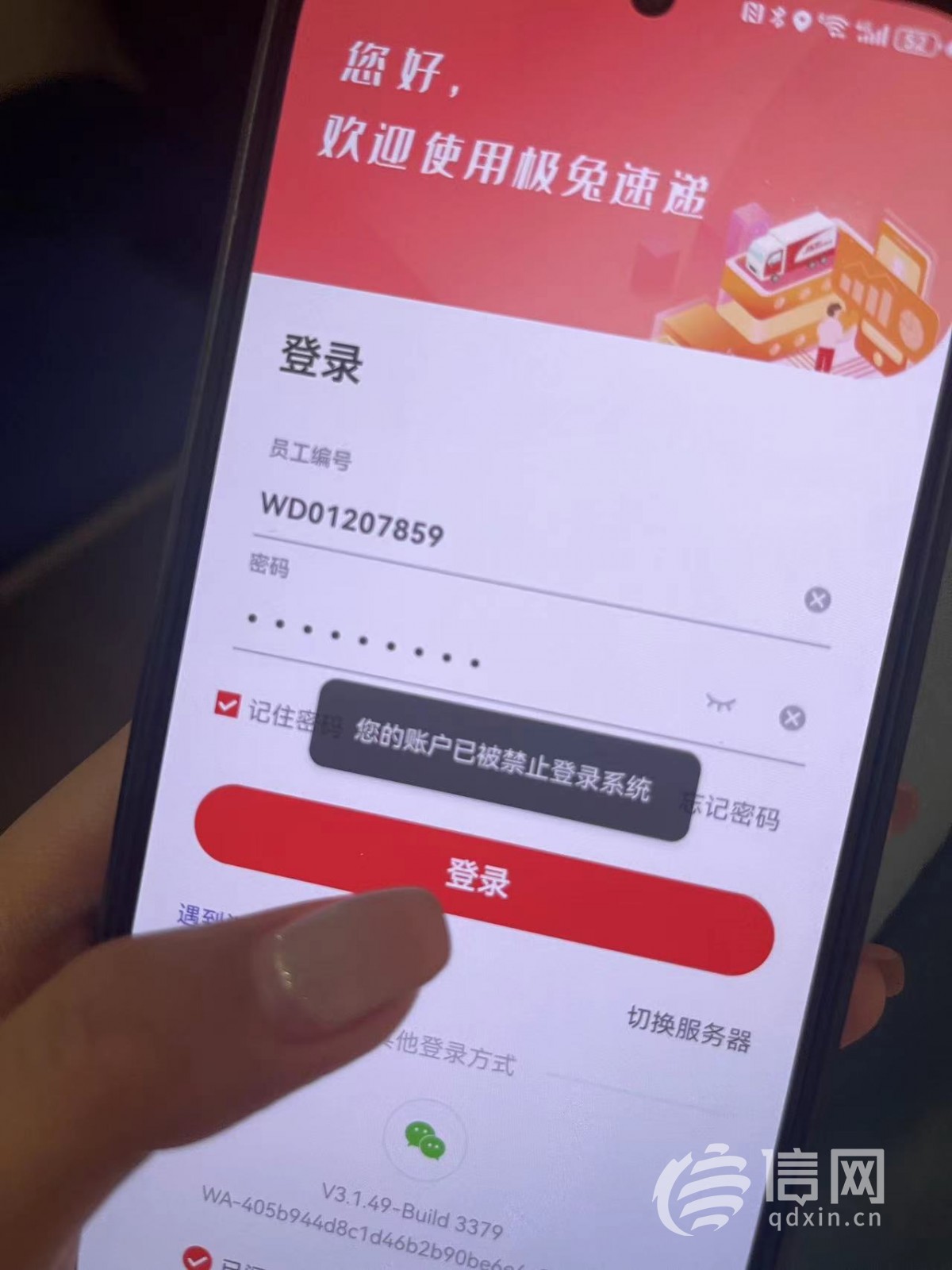 但霍先生并没有与极兔速递有限公司签订劳动合同。“当初在招聘网站上看到这里招快递员,来了以后培训大概两天,负责人便让我注册了极兔速递App员工账号,职务为小件员。”霍先生表示,他每取一个件就会有3元左右的佣金,收入实行“分润减半”的形式,即扣除每单佣金的50%作为押金。目前,霍先生已经无法登录极兔速递App后台,输入工号和密码后,登陆页面显示“您的账户已被禁止登陆系统”。
