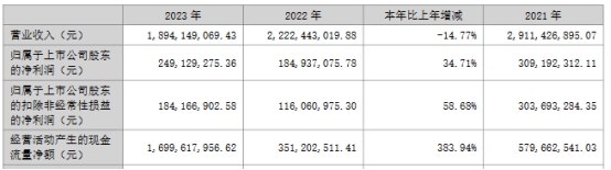 2023年年报显示,去年,公司实现营业收入18.94亿元,同比下降14.77%;归母净利润2.49亿元,同比增长34.71%;扣非净利润1.84亿元,同比增长58.68%;经营活动产生的现金流量净额为17.00亿元,同比增长383.94%。