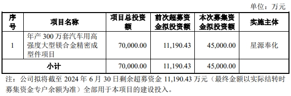 星源卓镁上周五晚间披露的向不特定对象发行可转换公司债券预案显示,公司本次申请向不特定对象发行可转换公司债券拟募集资金总额不超过45,000万元(含),所募集资金扣除发行费用后,拟用于年产300万套汽车用高强度大型镁合金精密成型件项目。