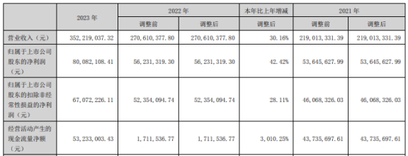 2023年,公司实现营业收入3.52亿元,同比增长30.16%;归属于上市公司股东的净利润8008.21万元,同比增长42.42%;归属于上市公司股东的扣除非经常性损益的净利润6707.22万元,同比增长28.11%;经营活动产生的现金流量净额5323.30万元,同比增长3,010.25%。