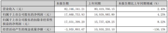 2024年第一季度,公司实现营业收入8234.63万元,同比增长2.40%;归属于上市公司股东的净利润1766.08万元,同比增长4.25%;归属于上市公司股东的扣除非经常性损益的净利润1703.14万元,同比增长8.22%;经营活动产生的现金流量净额-395.09万元,上年同期为1093.02万元。