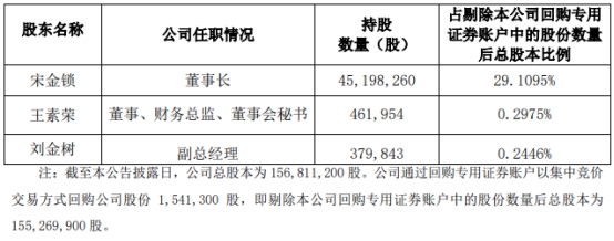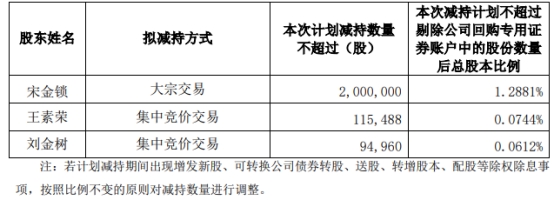高级管理人员刘金树持有公司股份379,843股(占剔除公司回购专用证券账户中的股份数量后总股本比例0.2446%),计划在公告披露之日起十五个交易日后的三个月内以集中竞价交易方式减持公司股份不超过94,960股(占剔除公司回购专用证券账户中的股份数量后总股本比例0.0612%)。