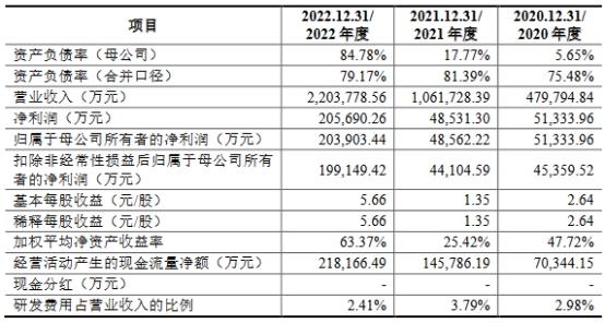 润阳股份2023年6月20日披露的招股书显示,2020年末至2022年末,公司营业收入分别为479,794.84万元、1,061,728.39万元、2,203,778.56万元,归属于母公司所有者的净利润分别为51,333.96万元、48,562.22万元、203,903.44万元,扣除非经常性损益后归属于母公司所有者的净利润分别为45,359.52万元、44,104.59万元、199,149.42万元,经营活动产生的现金流量净额分别为70,344.15万元、145,786.19万元、218,166.49万元。