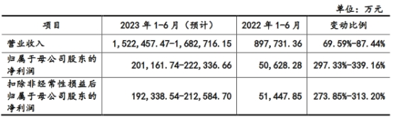 2023年上半年,公司预计实现营业收入1,522,457.47万元至1,682,716.15万元,同比增长69.59%至87.44%,预计实现归属于母公司股东的净利润为201,161.74万元至222,336.66万元,同比增长297.33%至339.16%,预计实现扣除非经常性损益后归属于母公司股东的净利润为192,338.54万元至212,584.70万元,同比增长273.85%至313.20%。