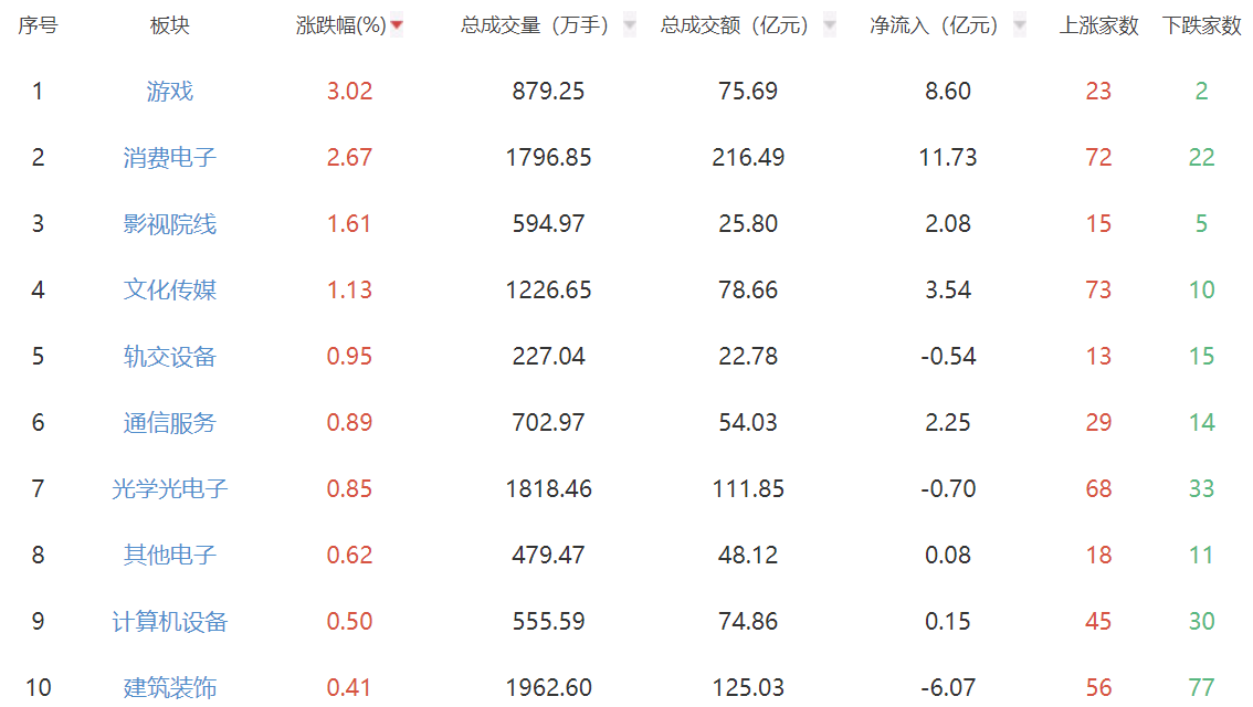 板块方面,游戏、消费电子板块涨幅居前,风电设备、医疗服务、钢铁板块跌幅居前。