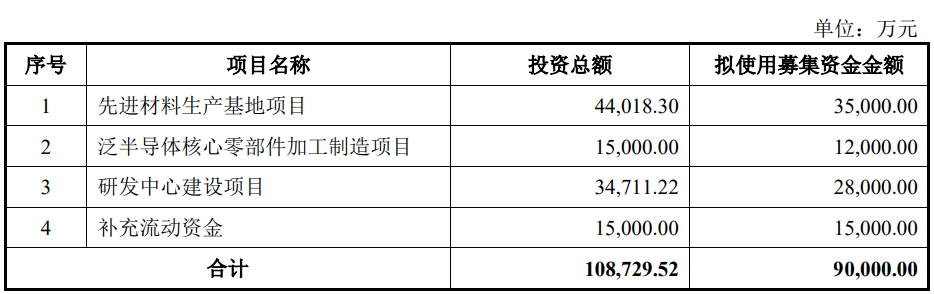 珂玛科技本次发行募集资金总额60,000.00万元,扣除发行费用后的募集资金净额为51,301.24万元。公司最终募集资金净额比原计划少38,698.76万元。珂玛科技2024年8月9日披露的招股书显示,公司拟募集资金90,000.00万元,用于先进材料生产基地项目、泛半导体核心零部件加工制造项目、研发中心建设项目、补充流动资金。