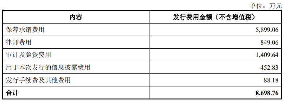 珂玛科技本次公司公开发行新股的发行费用(不含增值税)合计8,698.76万元,其中保荐承销费用5,899.06万元。
