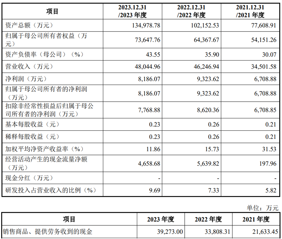 2021年至2023年,珂玛科技的营业收入分别为34,501.58万元、46,246.94万元和48,044.96万元;净利润/归属于母公司所有者的净利润分别为6,708.88万元、9,323.62万元和8,186.07万元;扣除非经常性损益后归属于母公司所有者的净利润分别为6,708.85万元、8,620.36万元和7,768.88万元。