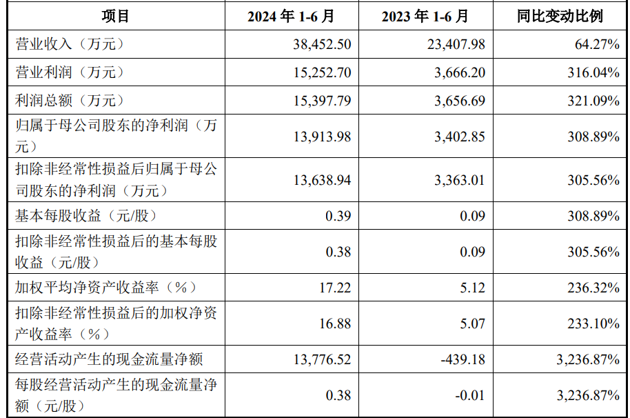 2024年1-6月,珂玛科技的营业收入为38,452.50万元,同比变动64.27%;归属于母公司股东的净利润13,913.98万元,同比变动308.89%;扣除非经常性损益后归属于母公司股东的净利润13,638.94万元,同比变动305.56%;经营活动产生的现金流量净额13,776.52万元,上年同期为-439.18万元。