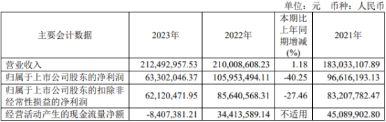 2023年,公司实现营业收入2.12亿元,同比增长1.18%;实现归属于母公司所有者的净利润6330.20万元,同比下降40.25%;实现归属于母公司所有者的扣除非经常性损益的净利润6212.05万元,同比下降27.46%;经营活动产生的现金流量净额为-840.74万元,上年同期为3441.36万元。