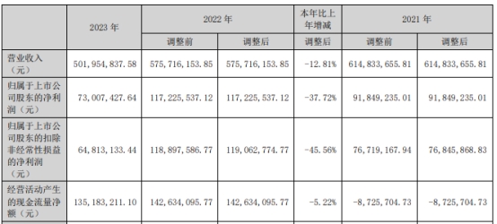 2023年,致尚科技实现营业收入5.02亿元,同比下降12.81%;归属于上市公司股东的净利润7300.74万元,同比下降37.72%;归属于上市公司股东的扣除非经常性损益的净利润6481.31万元,同比下降45.56%;经营活动产生的现金流量净额1.35亿元,同比下降5.22%。