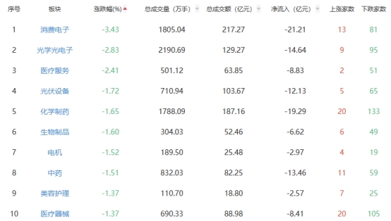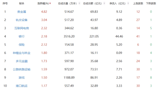 板块方面,贵金属、轨交设备、互联网电商等涨幅靠前,消费电子、光学光电子、医疗服务等跌幅靠前。