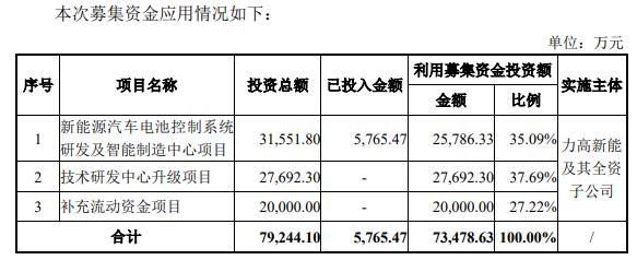力高新能原拟在深交所创业板发行股票数量不超过13,775,087股,占公司发行后总股本的比例不低于25%,不涉及原股东公开发售股份的情形。力高新能原拟募集资金73,478.63万元,用于新能源汽车电池控制系统研发及智能制造中心项目、技术研发中心升级项目、补充流动资金项目。