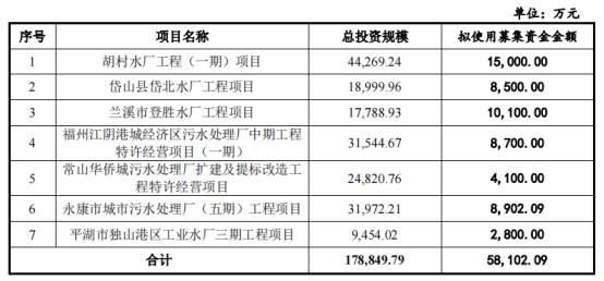 钱江水利于2024年6月8日发布2023年度向特定对象发行A股股票募集说明书(修订稿)显示,公司本次向特定对象发行A股股票募集资金总额拟不超过人民币58,102.09万元(含本数),扣除发行费用后的募集资金净额将全部用于以下项目:胡村水厂工程(一期)项目、岱山县岱北水厂工程项目、兰溪市登胜水厂工程项目、福州江阴港城经济区污水处理厂中期工程特许经营项目(一期)、常山华侨城污水处理厂扩建及提标改造工程特许经营项目、永康市城市污水处理厂(五期)工程项目、平湖市独山港区工业水厂三期工程项目。