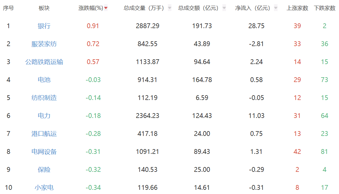 板块方面,银行股持续强势,服装家纺涨幅居前,游戏、影视院线、能源金属板块跌幅居前。