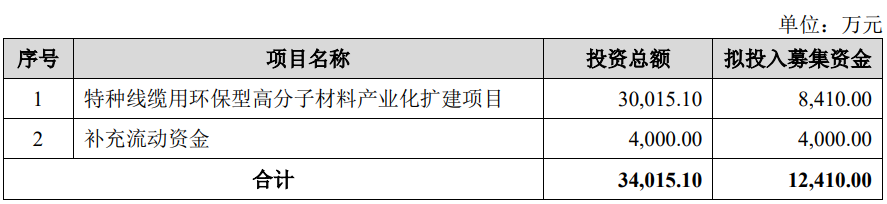本次发行超额配售选择权行使前,太湖远大的募集资金总额为12,410.00万元,扣除发行费用后的募集资金净额为10,399.14万元。公司募集资金净额比原计划少2,010.86万元。太湖远大2024年8月9日披露的招股书显示,公司拟募集资金12,410.00万元,用于特种线缆用环保型高分子材料产业化扩建项目、补充流动资金。