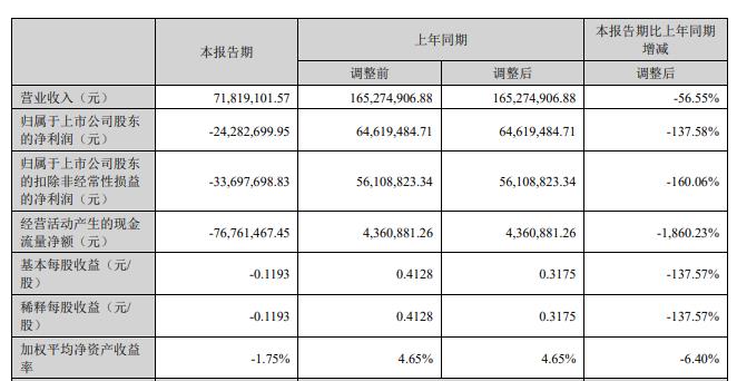 中国经济网北京8月23日讯 铖昌科技(001270.SZ)昨晚发布2024年半年度报告。2024年上半年,铖昌科技实现营业收入7181.91万元,同比下滑56.55%;归属于上市公司股东的净利润-2428.27万元,上年同期为6461.95万元;归属于上市公司股东的扣除非经常性损益的净利润-3369.77万元,上年同期为5610.88万元;经营活动产生的现金流量净额为-7676.15万元。