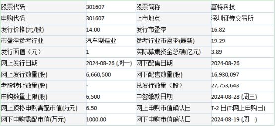 富特科技于2024年8月23日披露的首次公开发行股票并在创业板上市发行公告显示,若本次发行成功,预计公司募集资金总额为38,855.10万元,扣除预计发行费用8,431.96万元(不含增值税)后,预计募集资金净额为30,423.14万元,如存在尾数差异,为四舍五入造成。