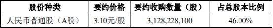 本次要约收购为收购人汇能海投向除收购人以外的上市公司全体股东发出的部分要约收购,要约收购股份数量为3,128,228,100股,占上市公司总股本的46.00%,要约价格为3.10元/股。