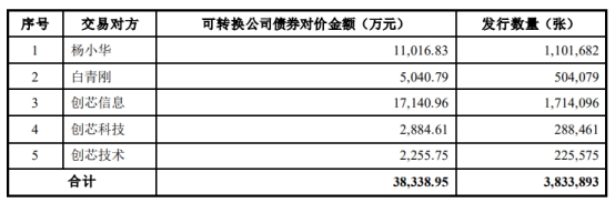 本次可转换公司债券的发行方式为向特定对象发行,发行对象为杨小华、白青刚、创芯信息、创芯科技、创芯技术。公司向交易对方合计发行的可转换公司债券数量为3,833,893张。